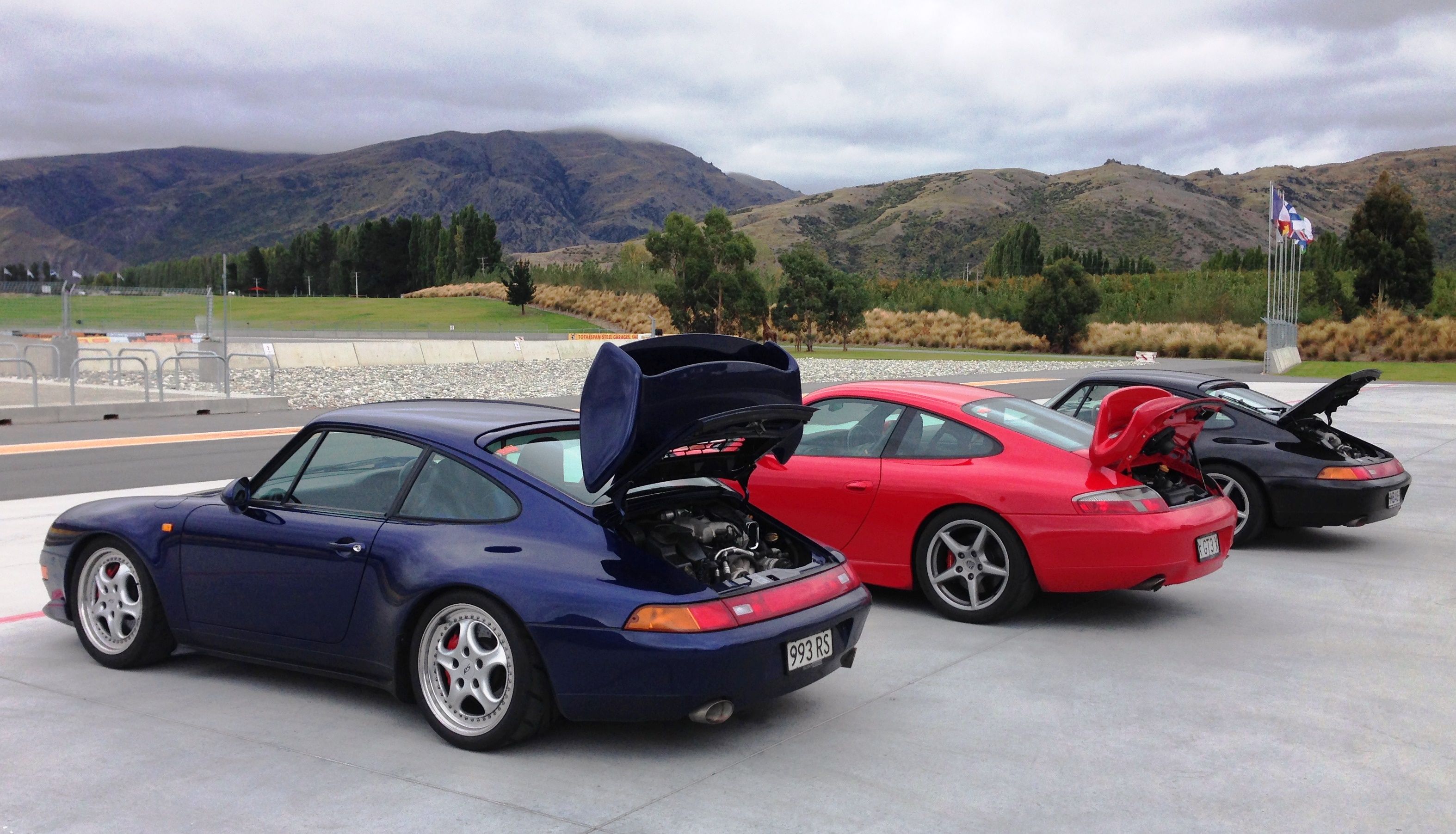 The hotel car park turned into a car wash lane giving us a chance to give them a clean and go over ready for the first track- Teretonga. We then went down to the track for a quick recce and first impressions were its narrow and no run off! Rain was forcast too. Gulp! Back at the hotel others were arriving- a 1000hp R32 GTR, R35 GTR, Cayman, 997 Targa, supercharged Nissan 350Z and an AC Cobra replica. It was an eclectic mix.